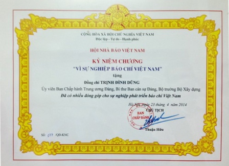 Xét đề nghị của Ban Chấp hành Hội Nhà báo Việt Nam, Chủ tịch Hội, Nhà báo Thuận Hữu đã vừa ký Quyết định tặng Kỷ niệm chương " Vì sự nghiệp Báo chí" cho đồng chí Trịnh Đình Dũng, ủy viên BCH Trung ương Đảng, Bí thư Ban Cán sự Đảng, Bộ trưởng Bộ Xây dựng.