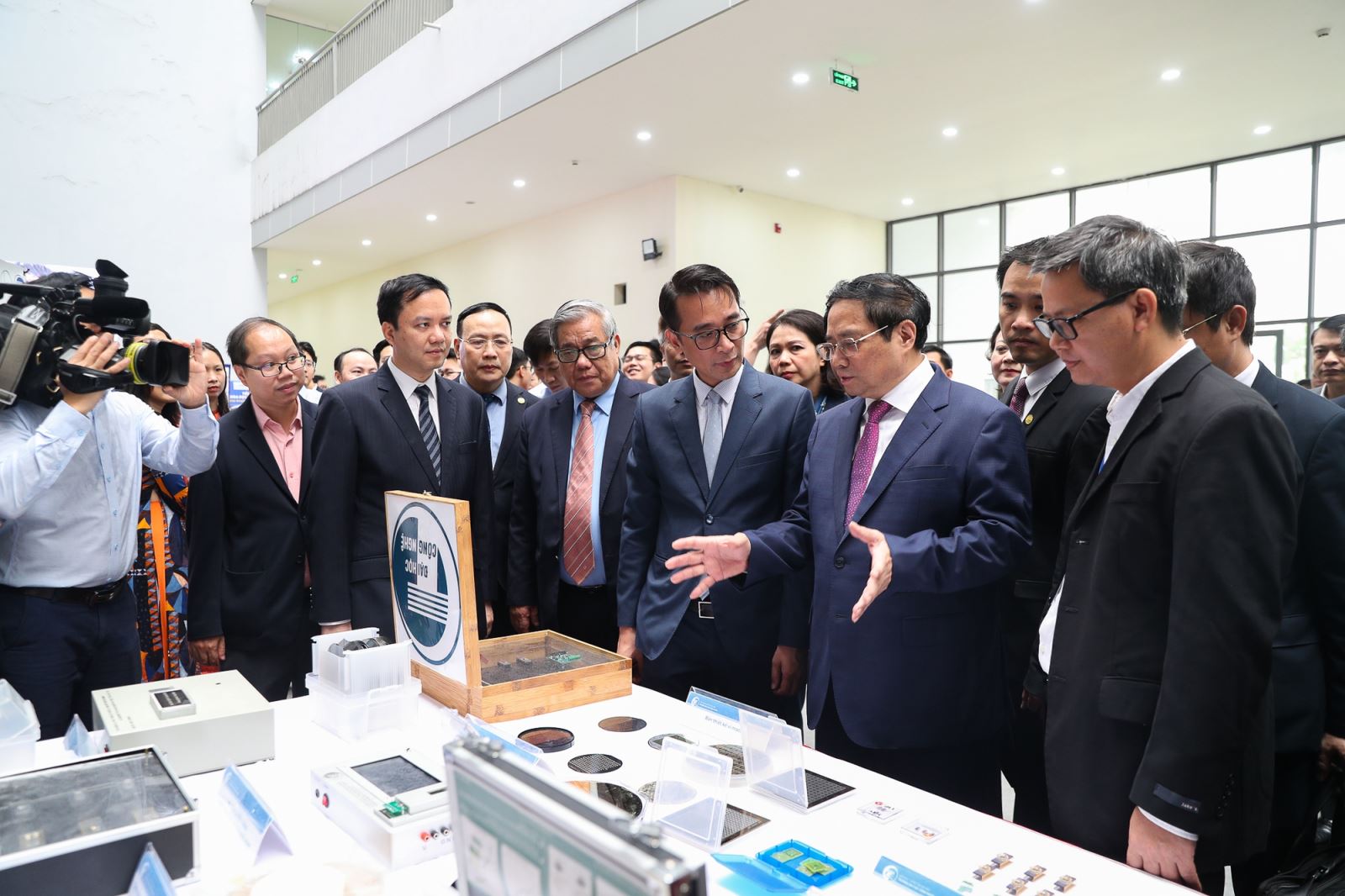 Thủ tướng Chính phủ Phạm Minh Chính thăm gian hàng triển lãm Khoa học Công nghệ của Trường ĐH Công nghệ trong chuyến thăm Khu đô thị ĐHQGHN tại Hòa Lạc năm 2023